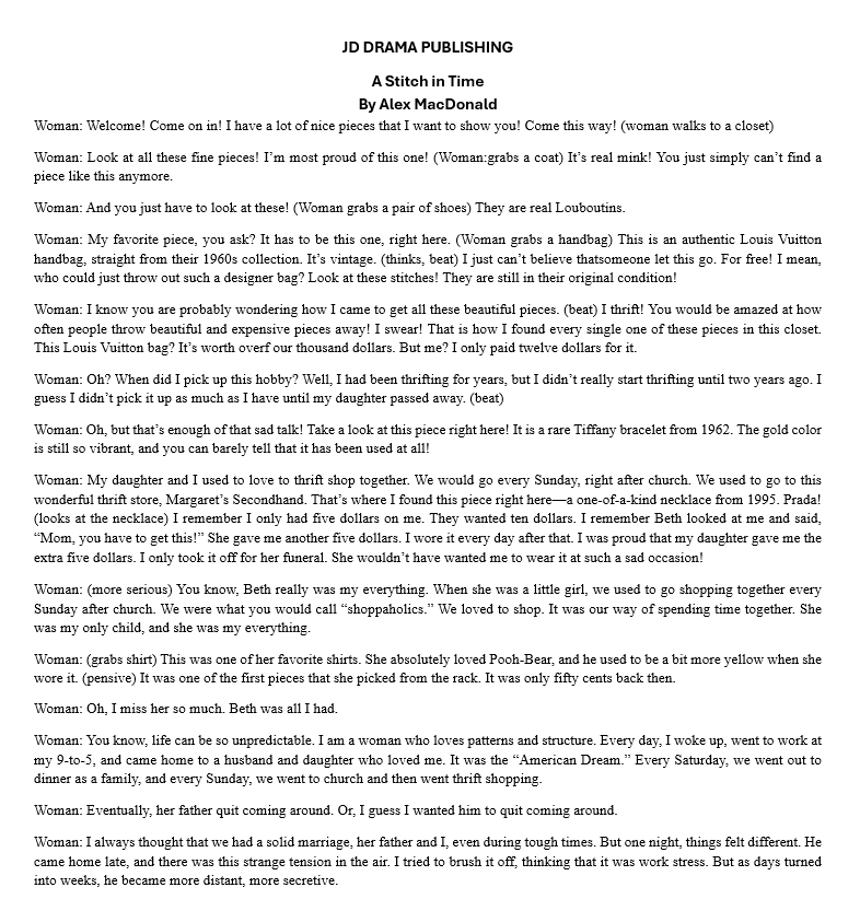 A Stitch in Time by Alex MacDonald (10-12 min., Cut as needed) Dramatic 8.00