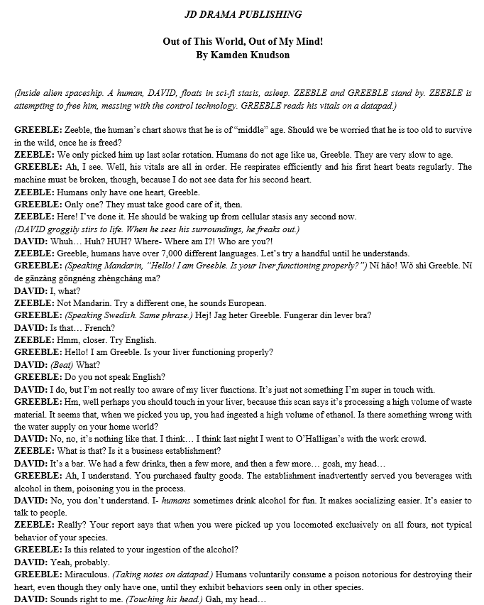 Out of This World, Out of My Mind! by Kamden Knudson (12-15 min. Cut as needed) M/F 10.00